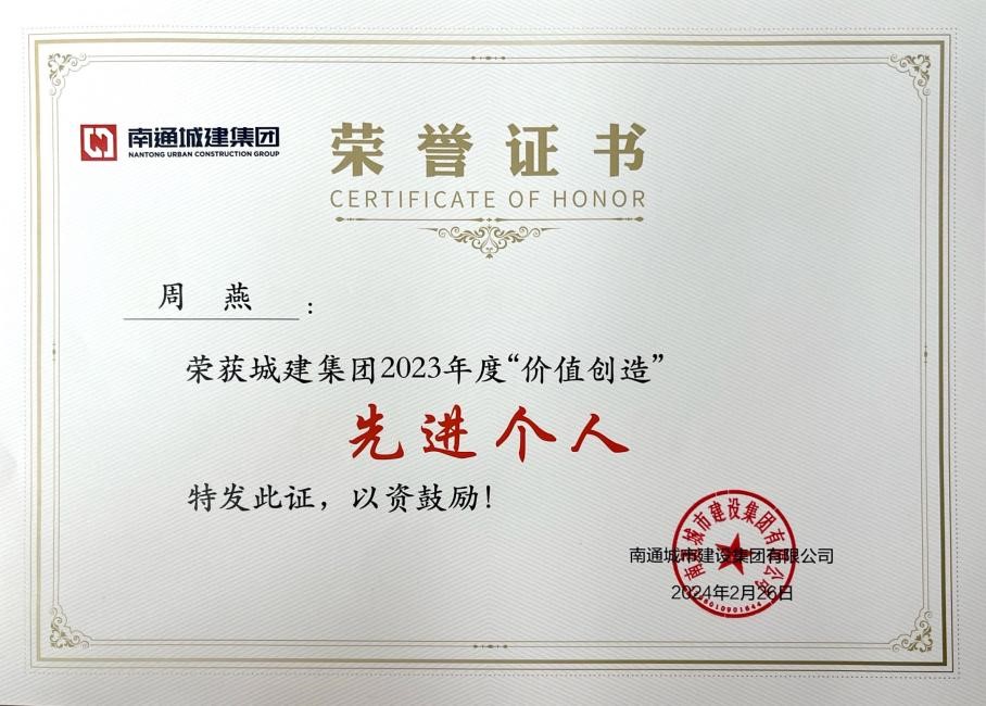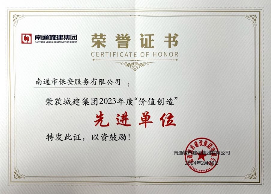 喜報——南通保安公司榮獲城建集團(tuán)“2023年度‘價值創(chuàng)造’先進(jìn)單位、優(yōu)秀攻堅團(tuán)隊、先進(jìn)個人”稱號