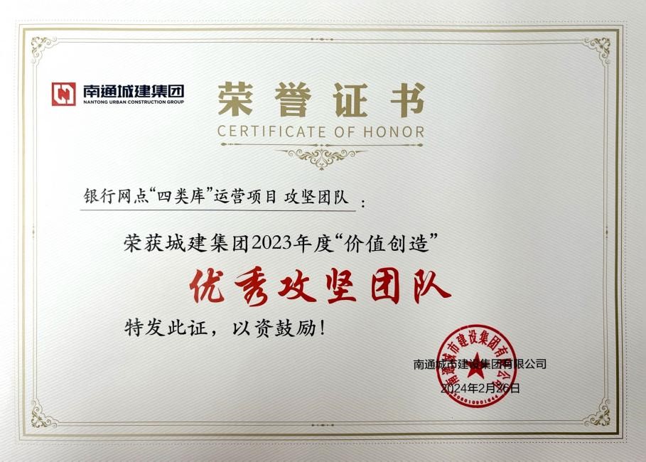 2024年2月26日,南通城市建設(shè)集團(tuán)有限公司舉辦了2024年度經(jīng)營工作會議,南通保安公司榮獲城建集團(tuán)“2023年度‘價值創(chuàng)造’先進(jìn)單位”稱號;銀行網(wǎng)點“四類庫”運(yùn)營項目 攻堅團(tuán)隊榮獲城建集團(tuán)“2023年度‘價值創(chuàng)造’優(yōu)秀攻堅團(tuán)隊”稱號;紅旗駕培周燕榮獲城建集團(tuán)“2023年度‘價值創(chuàng)造’先進(jìn)個人”稱號!